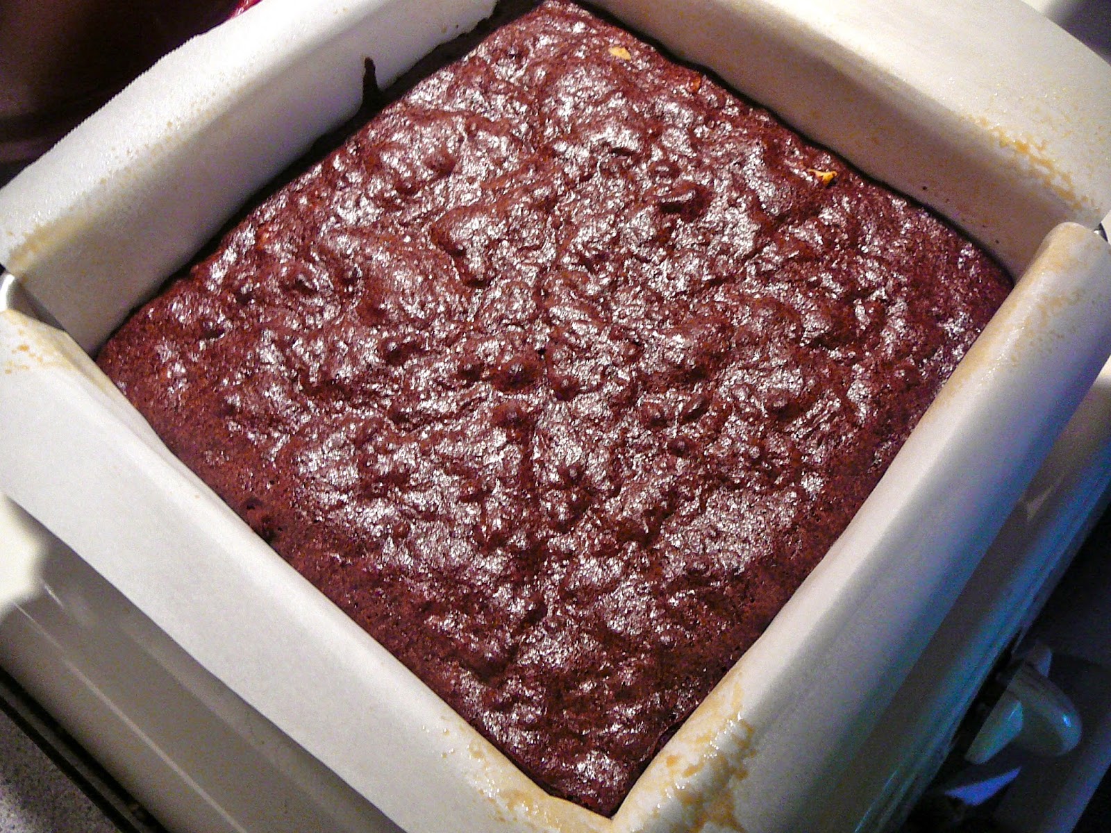 Spread into the prepared pan and bake for 25 minutes or until a toothpick inserted in the center comes out ALMOST clean.  Cool completely before removing from the pan and slicing.  Yield 16 squares.